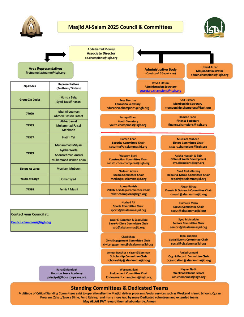 Meeting Minutes for the monthly meetings of the Masjid’s Council are available to ISGH members after they are published. Council meetings are scheduled to take place at least once a month and sometimes more to address specific needs. Since the discussions sometimes involve community specific matters, these minutes are only available to ISGH members, and can be accessed from the ISGH Member Portal.