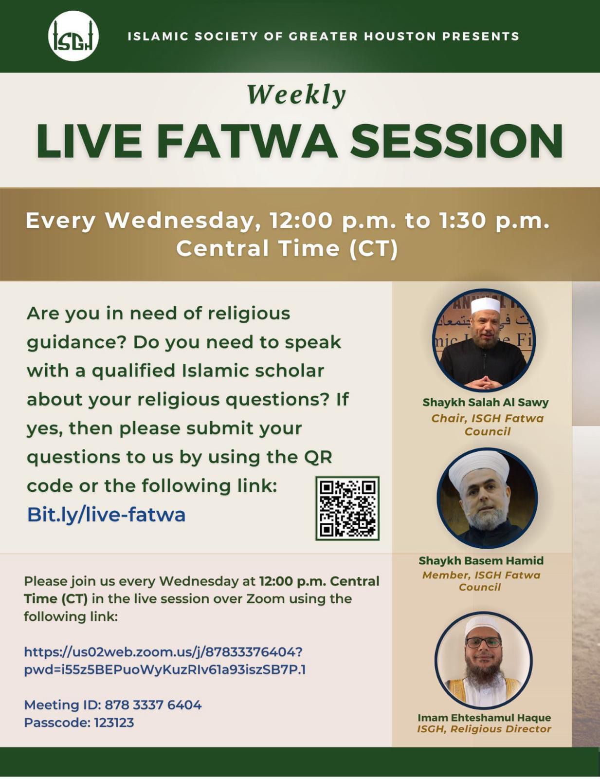 - Question Submission Link: Bit.ly/live-fatwa
